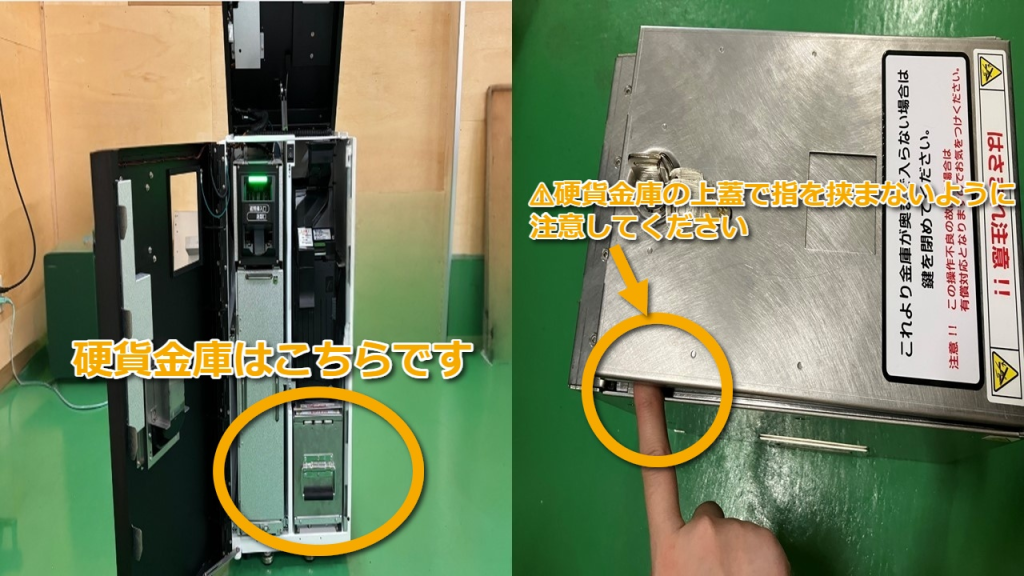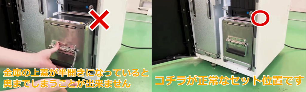 【お願い①】現金回収時、硬貨金庫の上蓋の鍵を閉めてからを収納してください。無理やり押し込んでしまうと故障の原因になります。